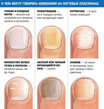 | Если глаза называют зеркалом души, то ногти с полным правом можно считать зеркалом здоровья человека. Поэтому, легко определить основные заболевания человека по здоровью ногтей. Если ногти крепкие, гладкие, блестящие, со слегка розовым оттенком, значит, скорее всего, организм функционирует нормально. Если же ногти имеют нездоровый вид, это может сигнализировать о начале болезни. Возможно, стоит посетить врача. Рассмотрим часто встречающиеся дефекты ногтей и попробуем разобраться, какой недуг за ними скрывается. Определяем здоровье по ногтям Бледные ногти Очень бледные ногти чаще всего говорят о старости. Но, они также могут быть признаком тяжелых болезней, таких как: анемия, застойная сердечная недостаточность, заболевания печени, истощение. Белые ногти Если ногти белые с темной окантовкой, это может быть связано с болезнями печени, такими как гепатит. При этом, пальцы обычно принимают желтоватый оттенок. Желтые ногти Определяя здоровье по ногтям, можно сказать, что одной из наиболее вероятных причин желтых ногтей является грибковая инфекция. В этом случае, ногти еще и утолщены и легко крошатся. Иногда желтые ногти могут свидетельствовать о более серьезных проблемах, таких, как тяжелое заболевание щитовидной железы, болезни легких, диабет или псориаз. Ногти с синеватым оттенком Такие ногти могут означать, что организм недополучает кислород. Также, это может указывать на инфекцию в легких, вызывающую пневмонию. Легкая синева, как правило, говорит о сахарном диабете. Волнистые ногти Если поверхность ногтя волнистая или испещрена бороздками, это может быть ранним симптомом псориаза или ревматоидного артрита. Интересно, что псориаз в 10% случаев начинается именно с ногтей. Ногтевая пластина при этом обычно обесцвечена, а ткань под ногтем имеет красно-коричневый оттенок. Ломкие или крошащиеся ногти Сухие, хрупкие ногти, которые часто ломаются или крошатся, могут сигнализировать о заболеваниях щитовидной железы. Эти же признаки, соединенные с желтым цветом ногтей, свидетельствуют о грибковой инфекции. Воспаленный ногтевой валик Если кожа вокруг ногтя кажется красной и опухшей, это говорит о воспалении ногтевого валика. Причиной может оказаться волчанка или иное заболевание соединительной ткани. Темные линии у основания ногтя Они должны быть исследованы как можно быстрее, так как иногда вызываются меланомой — самым опасным типом рака кожи.